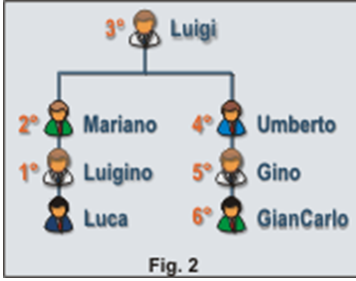 Nella figura 2 notiamo com’è possibile stabilire i gradi di “parentela collaterale”. Sempre escludendo la persona da cui si parte si può dire che Luca è parente di primo grado con Luigino