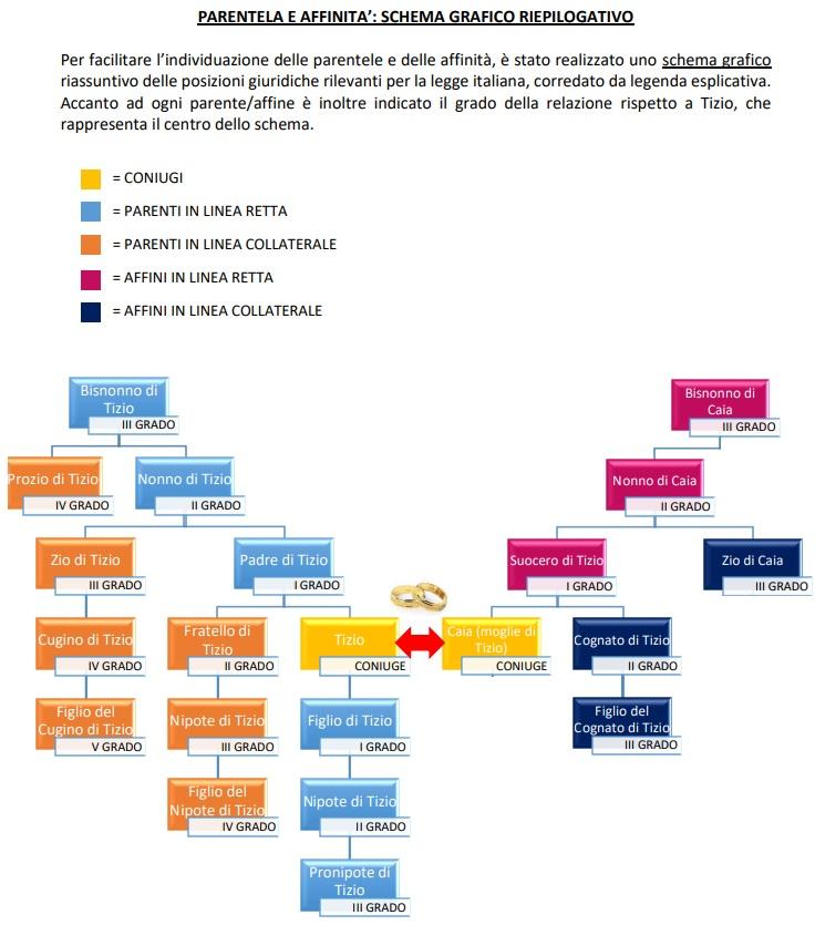 In base agli artt. 74,75 e seguenti del Codice Civile si precisa che: - la parentela è il rapporto giuridico che intercorre tra persone che discendono da uno stesso stipite e sono quindi legate tra loro da un vincolo di consanguineità; - l’affinità è il vincolo tra il coniuge e i parenti dell’altro coniuge. Si precisa inoltre che i coniugi (legati da rapporto di coniugio, ossia di matrimonio), non sono né parenti né affini.