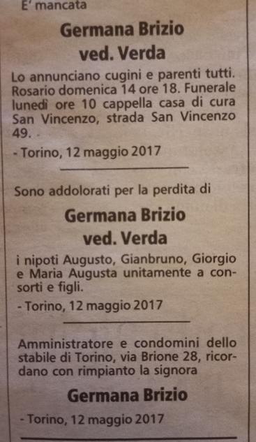8) Da LA STAMPA del 12-5-2017 recuperato il necrologio riferito a Germana Brizio:
