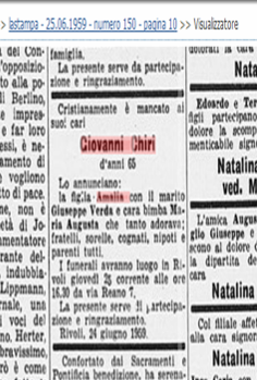1) Da LA STAMPA n- 150 del 25-06-1959 pag.10, recuperato il necrologio riferito a Giovanni Chiri: