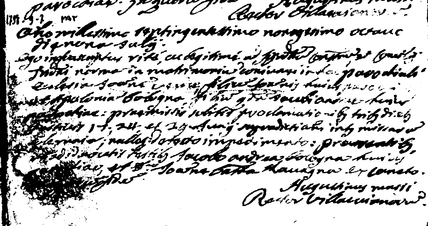 Anno 1798 il 9 luglio Io sottoscritto Agostino Mussi,rettore di Villaviani, in questa parrocchia ho unito in matrimonio :GiovanniVerda figlio di Giovanni di questa parrocchia e :Apollonia Bologna figlia di Giacomo Andrea Bologna diquesta parrocchia. Premessi i soliti 3 proclami neigiorni festivi del 17-21- e 2 giugno durante la messa solenne e non avendoricevuto nessun impedimento canonico.Giunsero testimoni di nozze GiacomoAndrea Bologna di questa Parrocchia e Giovanni Battista Lavagna da Conneto?Agostino Mussi rettore di Villaviani.